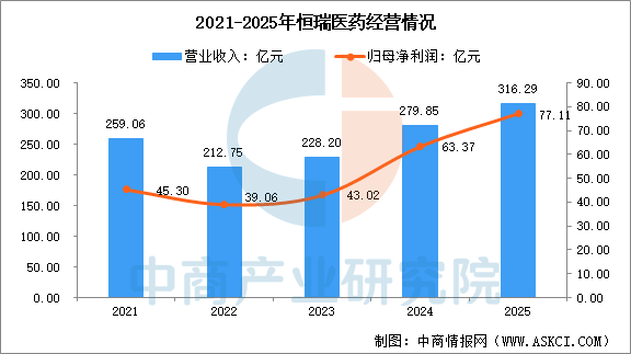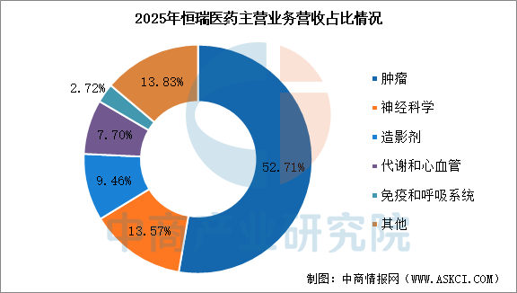2025年,恒瑞醫藥營業收入為316.29億元,同比增長13.02%,歸母凈利潤為77.11億元,同比增長21.69%。2025年主營產品包括腫瘤、神經科學、造影劑、代謝和心血管、免疫和呼吸系統產品,營收分別占整體的52.71%、13.57%、9.46%、7.70%、2.72%。