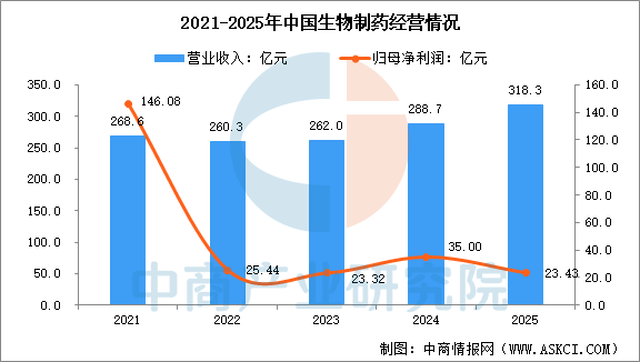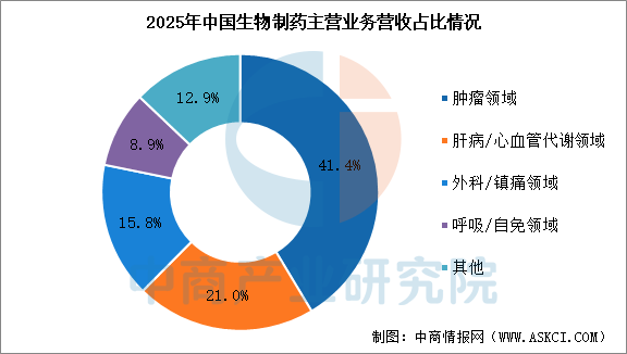 2025年,中國生物制藥營業收入為318.3億元,同比增長10.3%,歸母凈利潤為23.43億元,同比增長22.0%,營收與凈利潤雙雙創下歷史新高。創新產品收入152.2億元,同比增長26.2%,占收入47.8%。2025年主要治療領域包括腫瘤、肝病/心血管代謝、外科/鎮痛、呼吸/自免領域,營收分別占整體的41.4%、21.0%、15.8%、8.9%、12.9%。