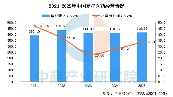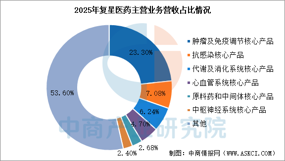 2025年,復星醫藥營業收入為416.62億元,同比增長1.45%,歸母凈利潤為33.71億元,同比增長22.61%。2025年主營產品包括腫瘤及免疫調節核心產品、抗感染核心產品、代謝及消化系統核心產品、心血管系統核心產品、原料藥和中間體核心產品、中樞神經系統核心產品,營收分別占收入的23.30%、7.08%、6.24%、4.70%、2.68%、2.40%。