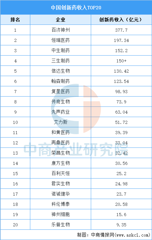 根據中國創新藥收入TOP20企業榜單,百濟神州以377.7億元居首,恒瑞醫藥、中國生物制藥等6家企業創新藥收入突破百億元,行業頭部效應顯著。總體來看,創新藥商業化能力持續提升,腫瘤領域仍是主要增長驅動力,行業正從研發投入期加速向規模化兌現期邁進。