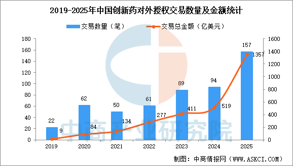 近年來,中國創新藥對外授權交易規模較快增長。醫藥魔方NextPharma數據庫顯示,截至2025年12月31日,中國創新藥商務拓展(BD)出海授權全年交易總金額達到1357億美元,首付款70億美元,交易總數量達到157筆,均創歷史新高。